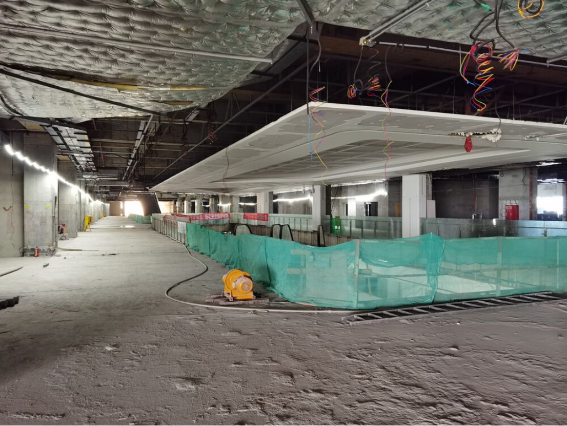 现场图片显示,商场外立面已完工,但内部地面裸露、管线杂乱,部分区域仅用绿色防护网简单围挡。虽能看到整体构造和电动扶梯,但毫无商业运营迹象。