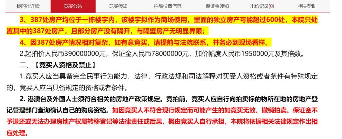 因部分房产未进行物理分隔且无明显界限,法院特别提醒竞买人务必实地看样,并强调:“因387处房产情况相对复杂,如有意竞买,请提前与法院联系,并务必到现场看样。”