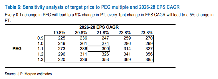 估值模型的调整是关键:该行采用的PEG倍数从1.5倍下调至1.1倍,反映了在当前高位下,对风险的考量权重增加。